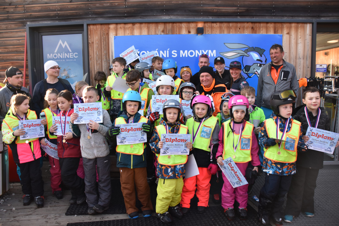 Naši žáci se již pátým rokem účastnili lyžařského výcviku ve středisku Monínec. Stejně jako minulé ročníky i tentokrát to byl týden, na který budeme všichni dlouho vzpomínat. Pod vedením trpělivých a zkušených instruktorů se děti učily vše od úplných začátků, až po zdokonalování techniky. Někteří malí sportovci stáli na lyžích poprvé a zkoušeli udržet rovnováhu, brzdit nebo zvládnout jízdu na vleku. Ti zkušenější se zase s chutí pouštěli do rychlejší jízdy a pilovali oblouky. Ačkoliv venku panovalo téměř jarních 15 stupňů, sníh na sjezdovce vydržel. Nebyla zima, podmínky byly příjemné a lyžování jsme si opravdu užili. S úsměvem, nadšením a někdy i s trochou té zdravé nervozity, která k učení nových věcí patří. Poslední den v pátek jsme se rozloučili s našimi skvělými instruktory. Na památku jsme dostali diplomy a medaile, které nám budou připomínat, jak jsme se během týdne zlepšili. Atmosféru ještě zpříjemnilo, že se na nás přijeli podívat rodiče a některé z nás po skončení výcviku rovnou odvezli domů. Všichni jsme se loučili s pocitem, že jsme zde prožili něco výjimečného. Domů jsme si odvezli nejen nové dovednosti, ale i spoustu krásných zážitků, které si budeme dlouho pamatovat. Lyžařský výcvik se opět stal jednou z nejoblíbenějších akcí roku a již se těšíme, co přinese ten příští.