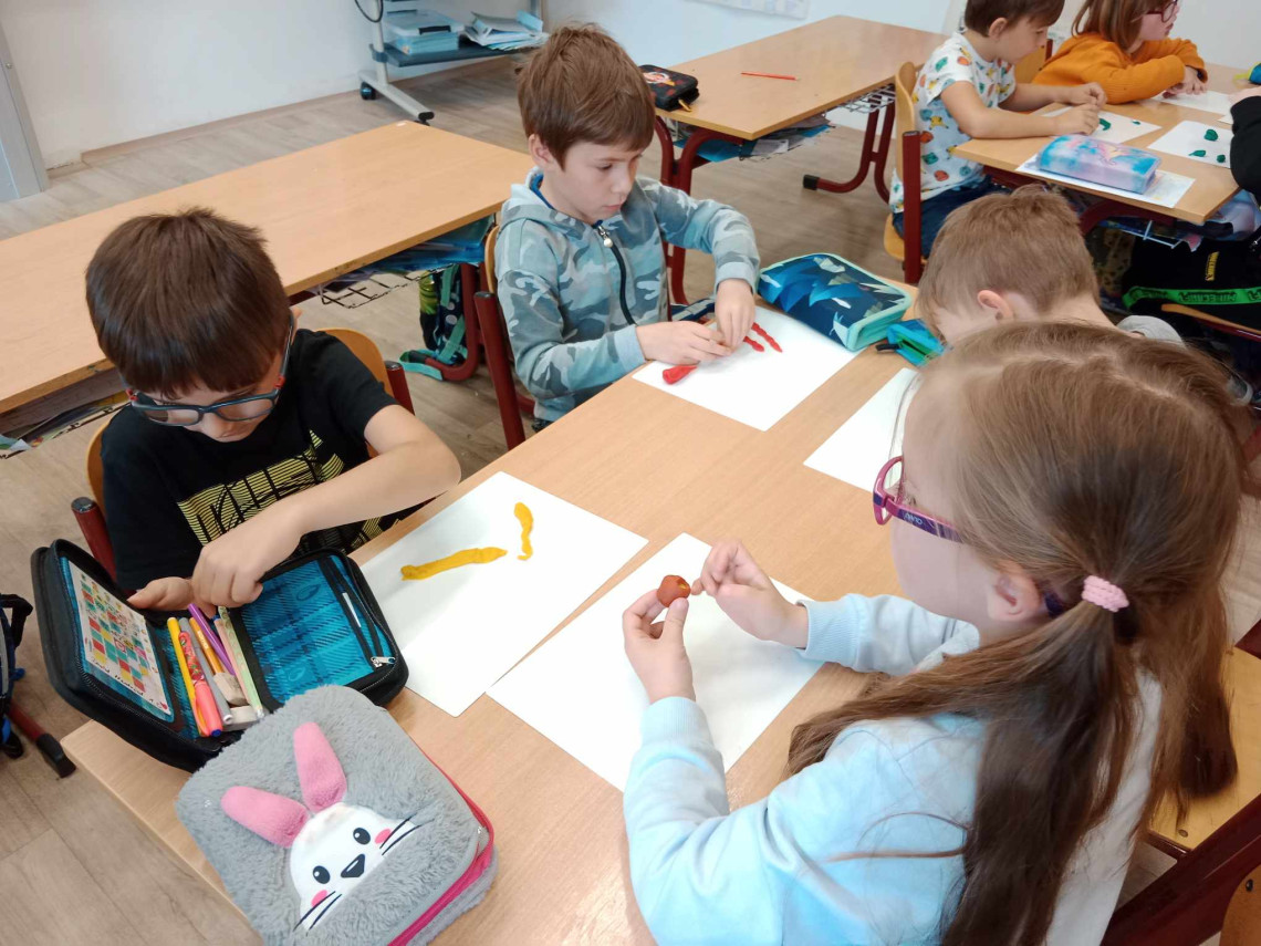 Dne 3. května do naší školy zavítali školitelé z organizace THEIA, která dělá preventivní programy pro děti. U nás prvňáčků proběhl program Bezpečný start do školního života. První hodinu jsme vyslechli a zhlédli pohádku o kamarádství a pak si každý nakreslil školu podle svých představ - vznikla škola diamantová, upírská, kočičí nebo škola na vodě s tobogánem. Pak jsme si hráli na agenty a tichou poštou si posílali tajné slovo, nakonec jsme měli ve skupinkách vymodelovat zadané zvíře, každý agent vymodeloval jednu část a pak jeden dával všechny komponenty poslepu dohromady.